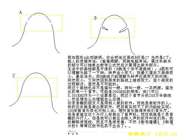 天狼晓月 21:15:53 首先,所谓的声音都是模拟音,转入电脑就已经把其数字化了,数字化就会损失很多信息。其次,数字信息记录的是波形图,这个波形图只是他记录下来的采样信息,他并不知道他原来是什么样。同样,人也不知道,例如二胡的一个扫弦会在电脑上记录下上千个动作点。所以,只是猜想可以还原“破损的波形”是不现实的。 天狼晓月 21:16:27 更简单的说,他是一个不规则图形,就象摊的鸡蛋饼,你咬了一口后,就不要再考虑把他画回原来样。 魔法皇帝 21:17:49 呵呵 画波形是为了让人理解的,电脑是用另外一种方式来处理的 天狼晓月 21:18:05 电脑是以多个采样点来处理的。 天狼晓月 21:18:30 44100KHz指的就是采样率。他并不是连续的。这比连续的波形更要命。 天狼晓月 21:18:43 不对,是44100Hz 魔法皇帝 21:18:52 唉 你不能接受就算了 魔法皇帝 21:19:32 对,不应该写KHZ,应该用DB或其他单位 我忘记改了 天狼晓月 21:19:54 理论上,如果我在一个不规则图形上抹掉一段线段,你是可以把他补上的,但是我可以肯定,你在不知道他的原始样子的情况下,是不可能画的和他一样的。 天狼晓月 21:20:45 而乐器更特殊。他发出的声音由于演奏的手法不同,同一个音符产生的效果也完全不会一样,那样的话,你想还原他,呵呵。 魔法皇帝 21:20:48 可以的 数字信号处理解决的就是这个问题。因为被抹掉的毕竟是很少一部分 天狼晓月 21:20:55 DB是分贝,音量的大小。 天狼晓月 21:22:21 拿最简单的鼓声举例。你敲那一下,会产生一个主音,多个谐音,以及鼓膜,鼓帮,架子等谐振的声音。你可以用数字去模拟他,然而,那绝对是电子音乐,而不是伴奏。 魔法皇帝 21:22:31 算了算了 你的对了,行了吧 我书白念了满意了吧
