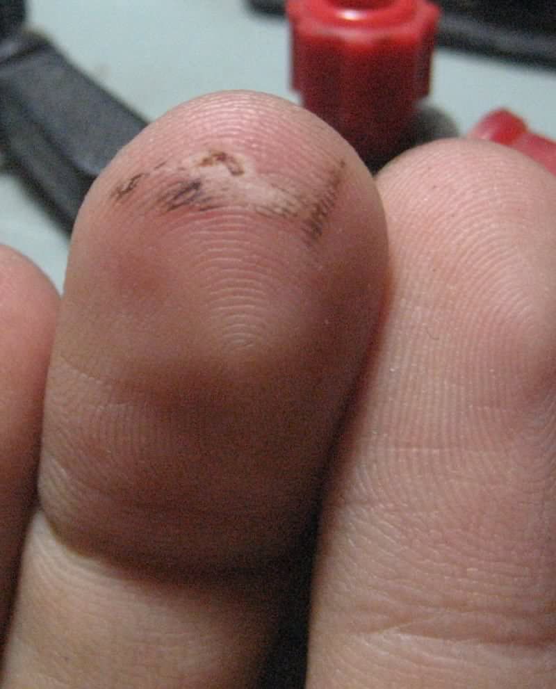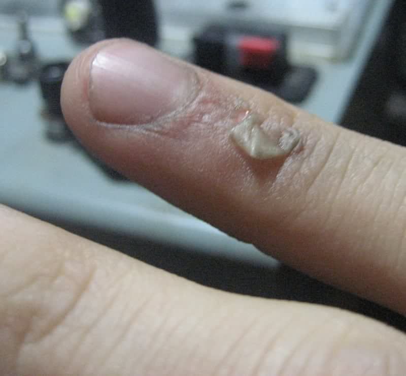 10V 150uF的钽电容,施加10V电压后正常,增加到12V,仍然无明显漏电。然后增加电压到17.35V(后来数字表所测量,之前是线性电源的指针表头),给电容接上电源不到两秒,砰的一声,注意这个声音不是爆炸声,是类似火药快速燃烧的那种声音。我猛一甩手(其实已经晚了...)然后很镇定的从工作间走到睡房(我常干这种自做镇定的事...),顺手抹了一下手指,然后发现手指上的一大块皮被抹了下来,顺便看到另三个手指上都留有高温脱水那种痕迹....然后恍然大悟原来我被烫伤了,于是立即想到我那亲爱的自来水....冲到洗手间,冲洗了两三分钟,回来想找找钽电容的残骸,结果发现这东西已经——总之不是粉身碎骨,好像是液化+气化了,屋子里全是某种树脂分解的味道(环氧?),瓷砖地上有几滴零散的深黑色液滴样痕迹,不过早已干涸(冷却?)。拿相机要给手指拍照(不疼...),打开相机,嘿嘿,没电了,上次用的时候还有电来着....去老妈那屋拿他的相机,一通胡乱拍摄后,放一边,来baidu打这文章,然后打了半页后机器死机(入夏就如此,但是最近还是很少见的...)然后重启动,死活进不去系统,手也开始火辣辣的疼起来,关机,到睡房开这边的机器打字了。手指受伤,只能用几个有限的手指敲,累死。先就敲这么多吧。看图。