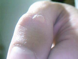 用热熔胶固定一根连线。用喷枪式火机加热了热熔胶使用完后,顺手把热熔胶的胶棒斜放在手边盒子上,结果由于放的有一定角度,热熔胶胶棒滑动了一下,融化部分粘了一滴在我大拇指关节上....当即脑袋一疼 —— 对,是脑袋一疼,然后为了不把盒子上一堆东西弄乱和把胶棒再弄掉,轻轻的抽回手.....用另只手把粘在手指上已经冷却的热熔胶撕下来.....结果.....见图一图二,嘿嘿....
