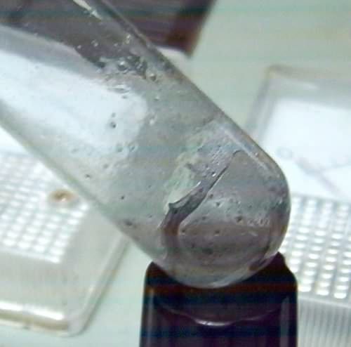 把那块钠放在纸上吸干液态石蜡(不是煤油),然后丢进去,把他放在眼前,看见钠浮在汞上方。然后我就晃了晃,凑近了看,因为记得书上提到制取的时候会在接触面上产生一些细小的火花.... 在晃了两三下之后,忽然就跟火药点燃一样“刺拉”一声猛烈的燃烧了一下,听声音,看力度都不亚于当量的黑火药.....眼前泛起来一道黄光(不是很强,但是也不暗).....吓的我赶紧把他拿离眼前,远看,里面钠汞已经混为一体,并且融化飞溅到试管壁上,然后里面还有一片白烟....