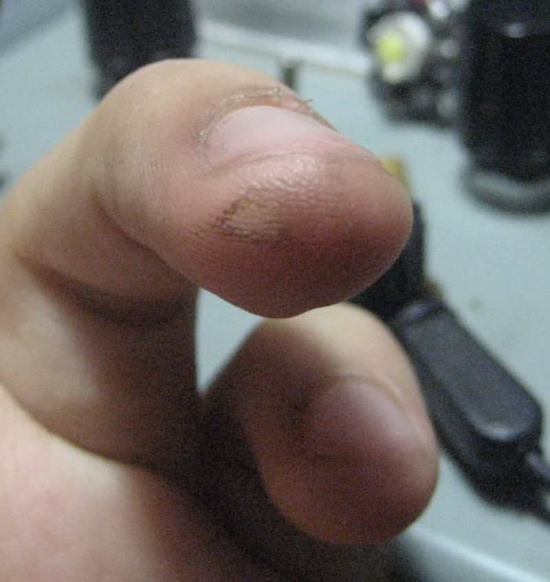 10V 150uF的钽电容,施加10V电压后正常,增加到12V,仍然无明显漏电。然后增加电压到17.35V(后来数字表所测量,之前是线性电源的指针表头),给电容接上电源不到两秒,砰的一声,注意这个声音不是爆炸声,是类似火药快速燃烧的那种声音。我猛一甩手(其实已经晚了...)然后很镇定的从工作间走到睡房(我常干这种自做镇定的事...),顺手抹了一下手指,然后发现手指上的一大块皮被抹了下来,顺便看到另三个手指上都留有高温脱水那种痕迹....然后恍然大悟原来我被烫伤了,于是立即想到我那亲爱的自来水....冲到洗手间,冲洗了两三分钟,回来想找找钽电容的残骸,结果发现这东西已经——总之不是粉身碎骨,好像是液化+气化了,屋子里全是某种树脂分解的味道(环氧?),瓷砖地上有几滴零散的深黑色液滴样痕迹,不过早已干涸(冷却?)。拿相机要给手指拍照(不疼...),打开相机,嘿嘿,没电了,上次用的时候还有电来着....去老妈那屋拿他的相机,一通胡乱拍摄后,放一边,来baidu打这文章,然后打了半页后机器死机(入夏就如此,但是最近还是很少见的...)然后重启动,死活进不去系统,手也开始火辣辣的疼起来,关机,到睡房开这边的机器打字了。手指受伤,只能用几个有限的手指敲,累死。先就敲这么多吧。看图。