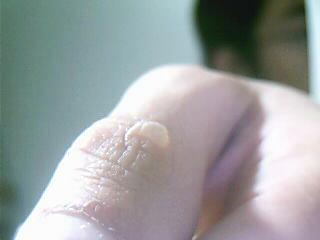 用热熔胶固定一根连线。用喷枪式火机加热了热熔胶使用完后,顺手把热熔胶的胶棒斜放在手边盒子上,结果由于放的有一定角度,热熔胶胶棒滑动了一下,融化部分粘了一滴在我大拇指关节上....当即脑袋一疼 —— 对,是脑袋一疼,然后为了不把盒子上一堆东西弄乱和把胶棒再弄掉,轻轻的抽回手.....用另只手把粘在手指上已经冷却的热熔胶撕下来.....结果.....见图一图二,嘿嘿....